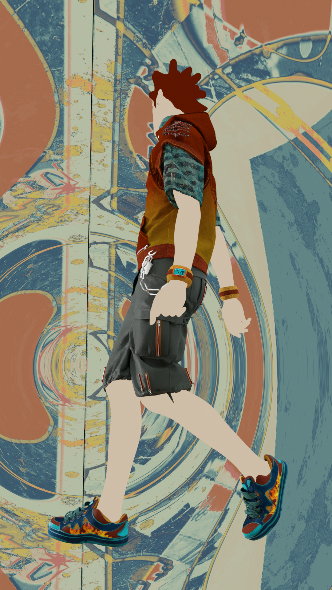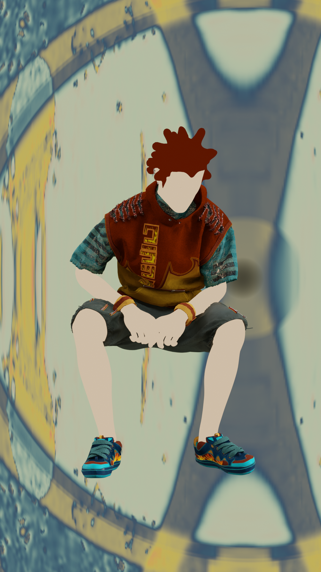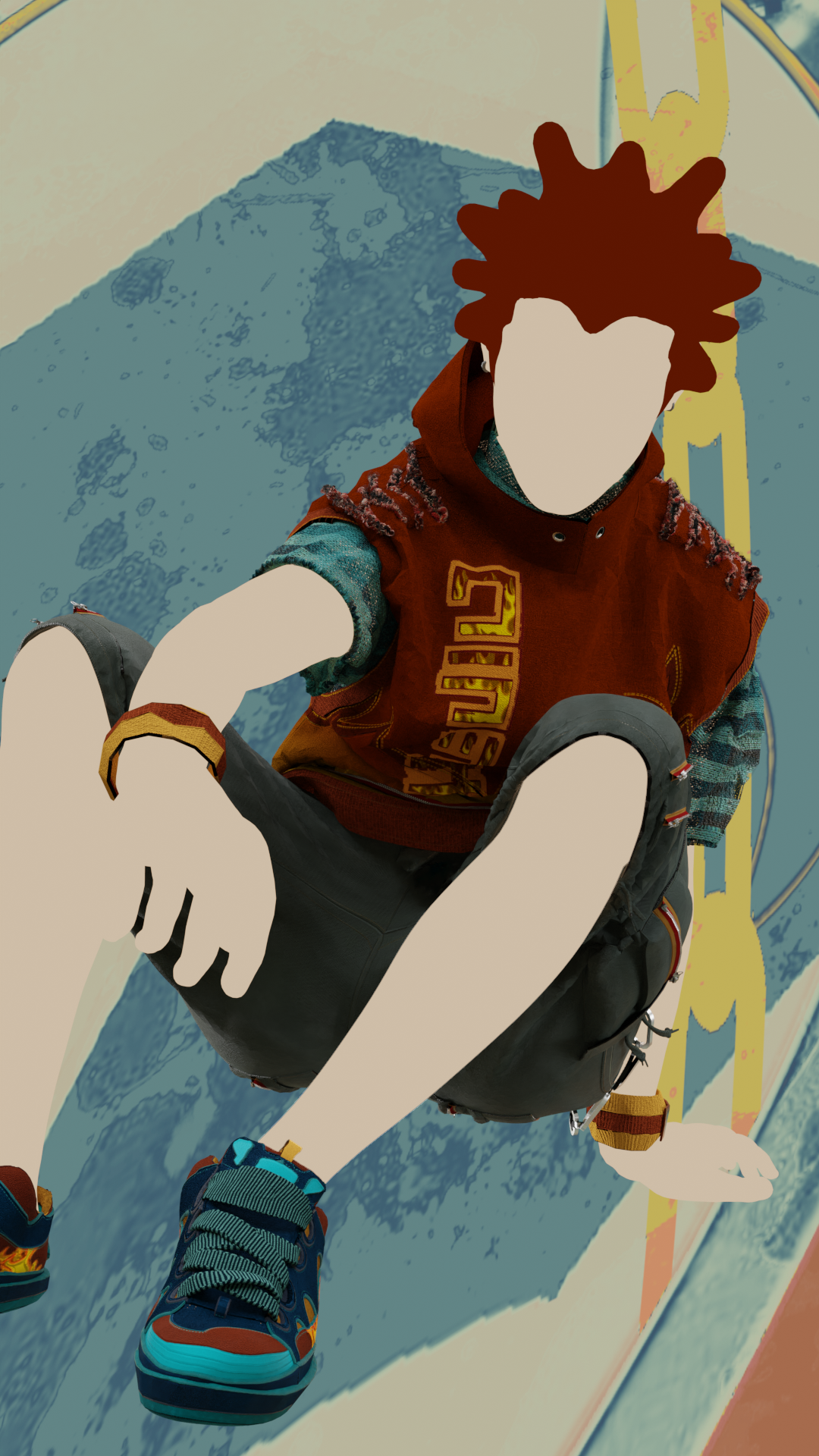 In Jet Set Radio Future, Clutch is an arrogant, graffitti-soul-stealing character possibly from America. In reimagining this character, I decided to reference men’s street fashion in the 90s, Martine Rose, corporate grunge aesthetic, and skatewear. The resulting design has a more complex construction, a radically altered silhouette, as well as sneakers instead of skates.