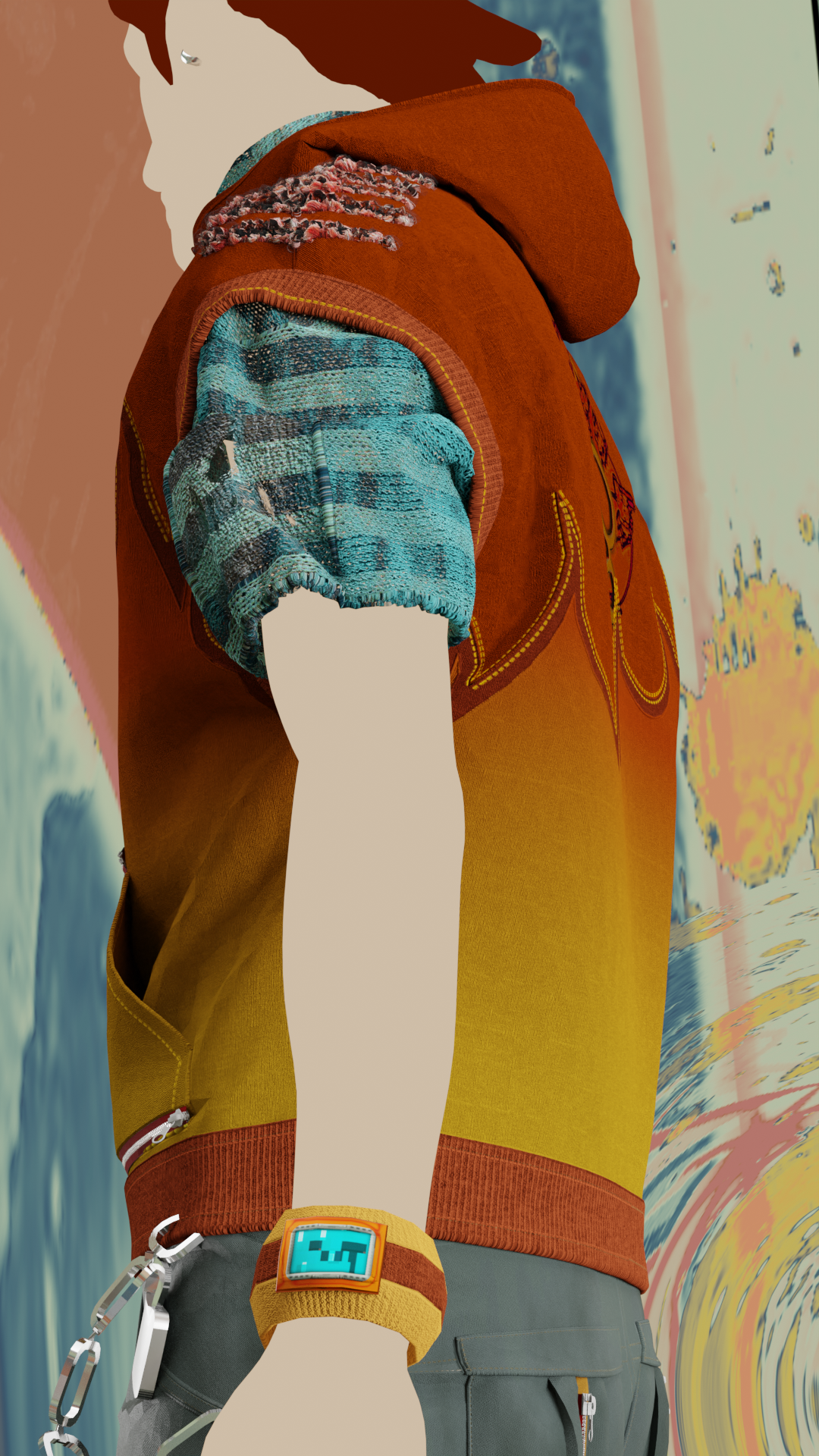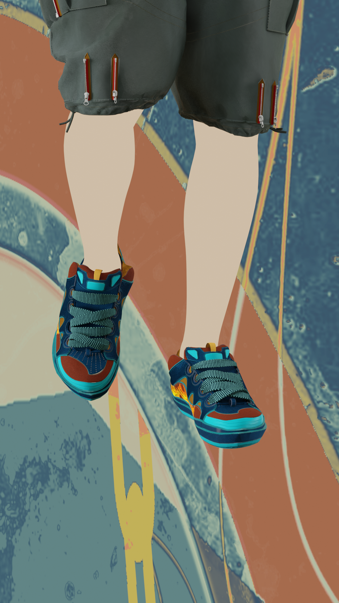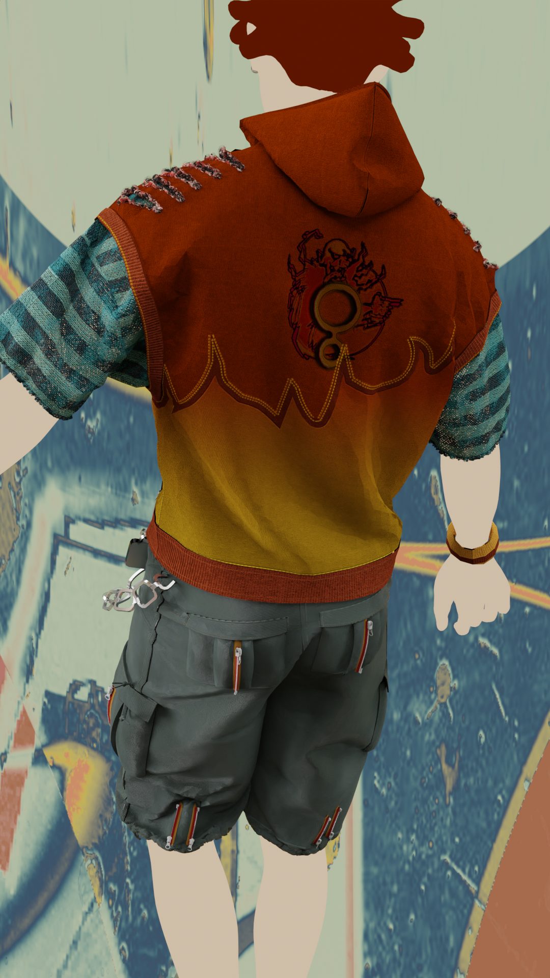 In Jet Set Radio Future, Clutch is an arrogant, graffitti-soul-stealing character possibly from America. In reimagining this character, I decided to reference men’s street fashion in the 90s, Martine Rose, corporate grunge aesthetic, and skatewear. The resulting design has a more complex construction, a radically altered silhouette, as well as sneakers instead of skates.